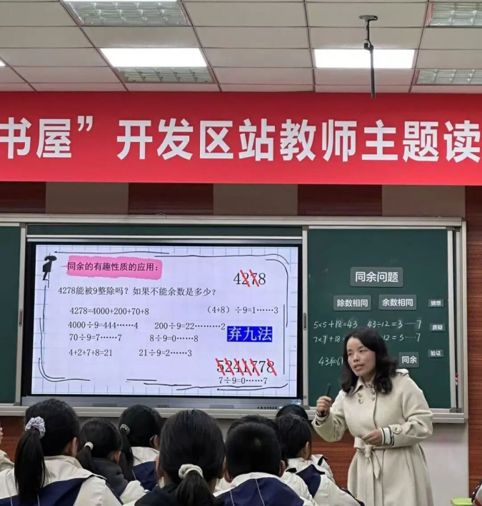 张洪妹老师执教了一节数学阅读课《心有灵犀,不点也通——同余问题》。先通过游戏导入,激发学生的好奇心和求知欲;再引导学生通过阅读,理解同余问题的内涵与外延;最后设疑,激发孩子对阅读的强烈需求及兴趣,促使每个孩子都能以书为友,以书为伴。