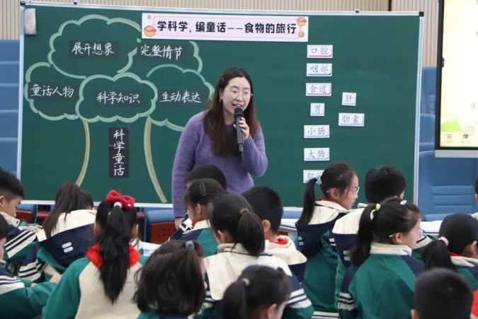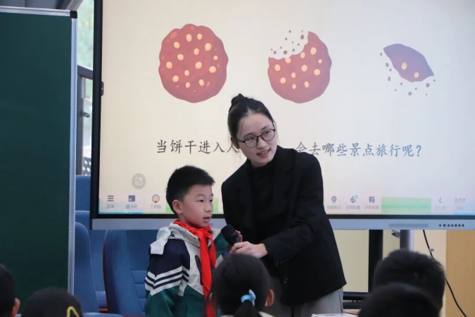 丁慧和徐梦娇老师共同执教《食物的旅行》,融合科学与语文,以编写童话为任务,通过小饼干在消化系统的旅程,引导学生感知口腔、胃、小肠等功能,穿插实验模拟直观展示原理。学生充分理解后,进行童话创编,营造了积极的具身学习情境。