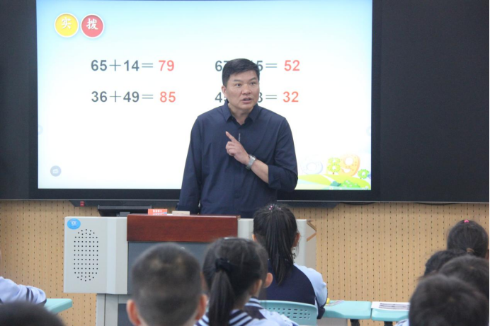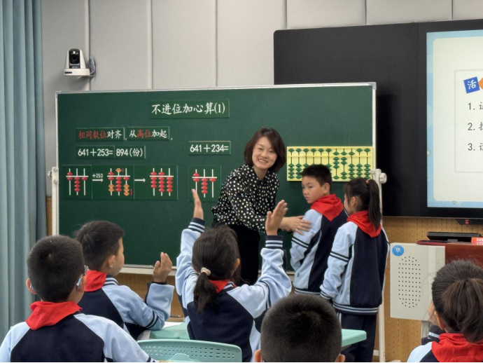 南通市开发区实小教育集团新河校区徐宝琴老师执教《进位加(2)》。徐老师通过空拨复习唤醒学生的珠算旧知,从一位数加一位、到两位数加一位数、再到两位数加两位数的进位加,引导学生进行知识迁移,总结拨珠方法,并通过编题思考进位条件并归纳规律。