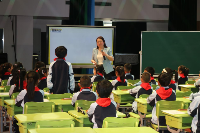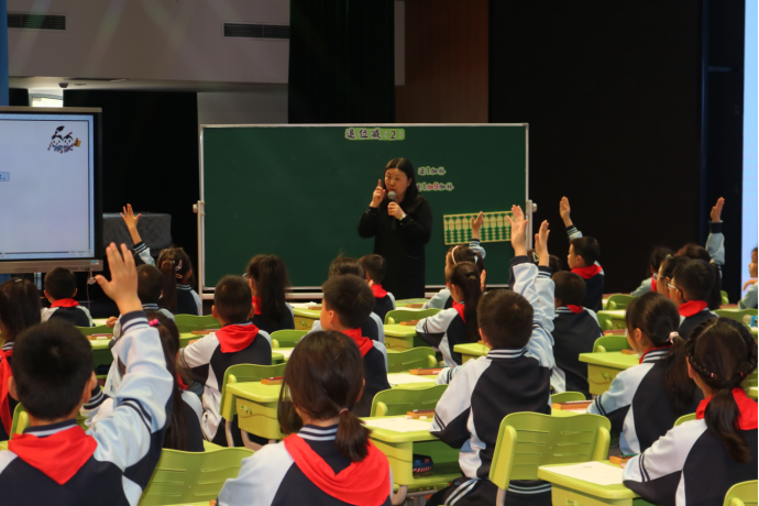 南通市郭里园小学吴晓萍老师执教《两位数乘整十数》。吴老师从《我多想去看看》课文引入创设情境,实现了与语文跨学科教学,引导学生完成珠心算的学习,从试拨到课件演示、同桌互拨、空拨校对,层层递进,助力学生内化珠算技能。
