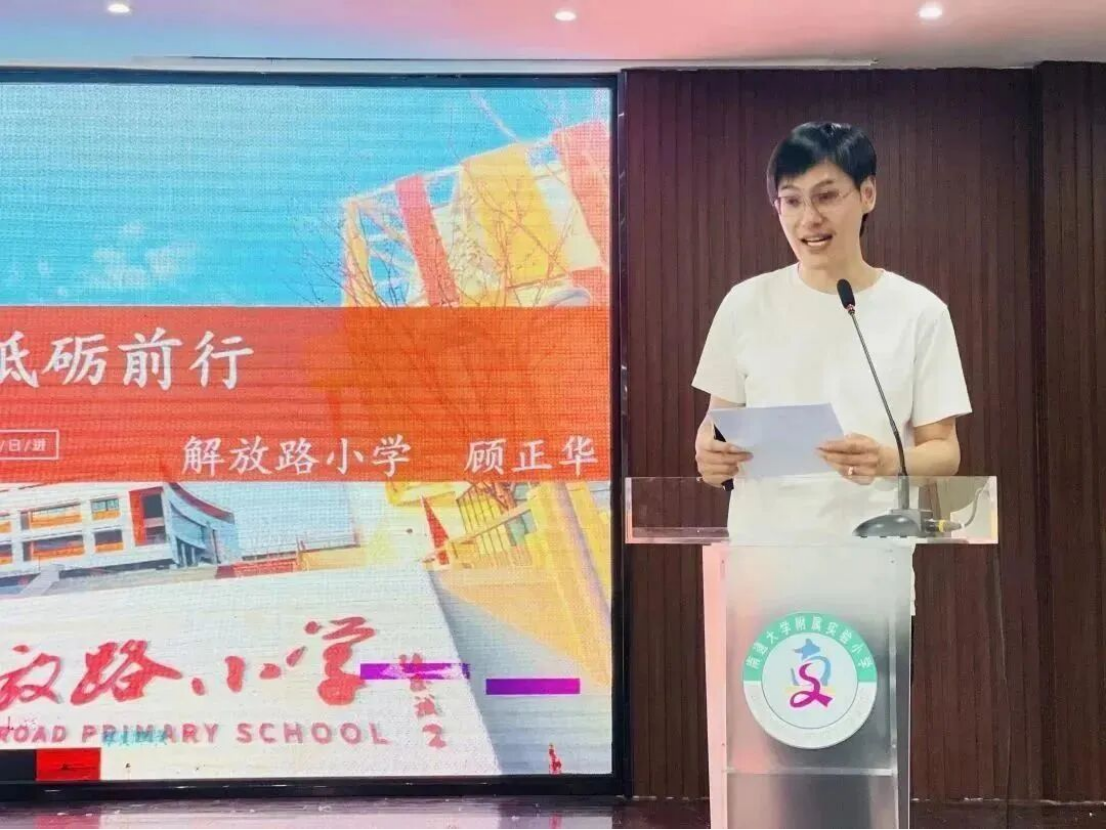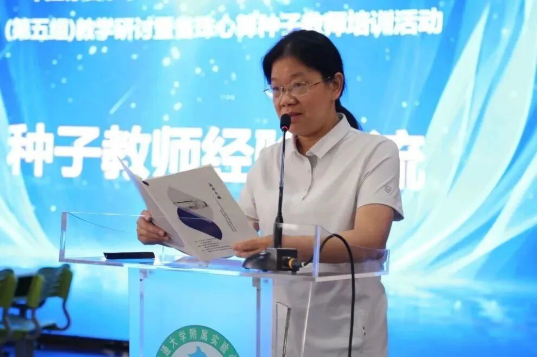 实小集团珠心算总教练杨晓林做了《聚焦“双减”,优化珠心算课堂练习设计》的主题报告。报告从课始、课中、课尾三个不同时段,结合具体课例,详细讲述如何优化珠心算课堂练习设计,报告有温度、有高度、有深度,令人深思。
