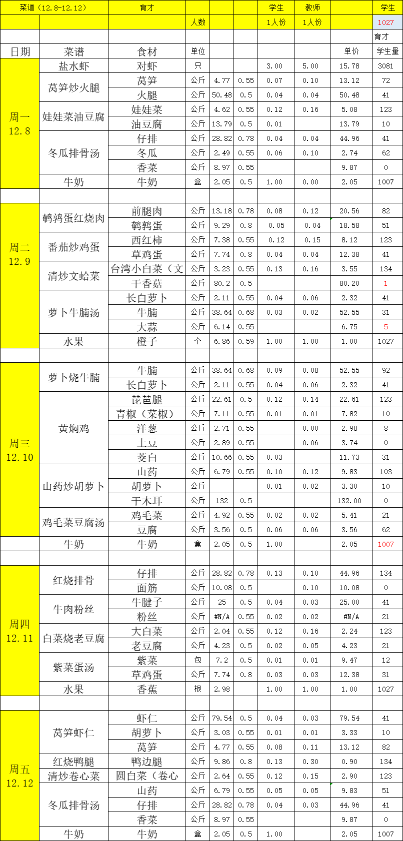 育才校区2025-2026学年度第一学期第15周带量菜谱